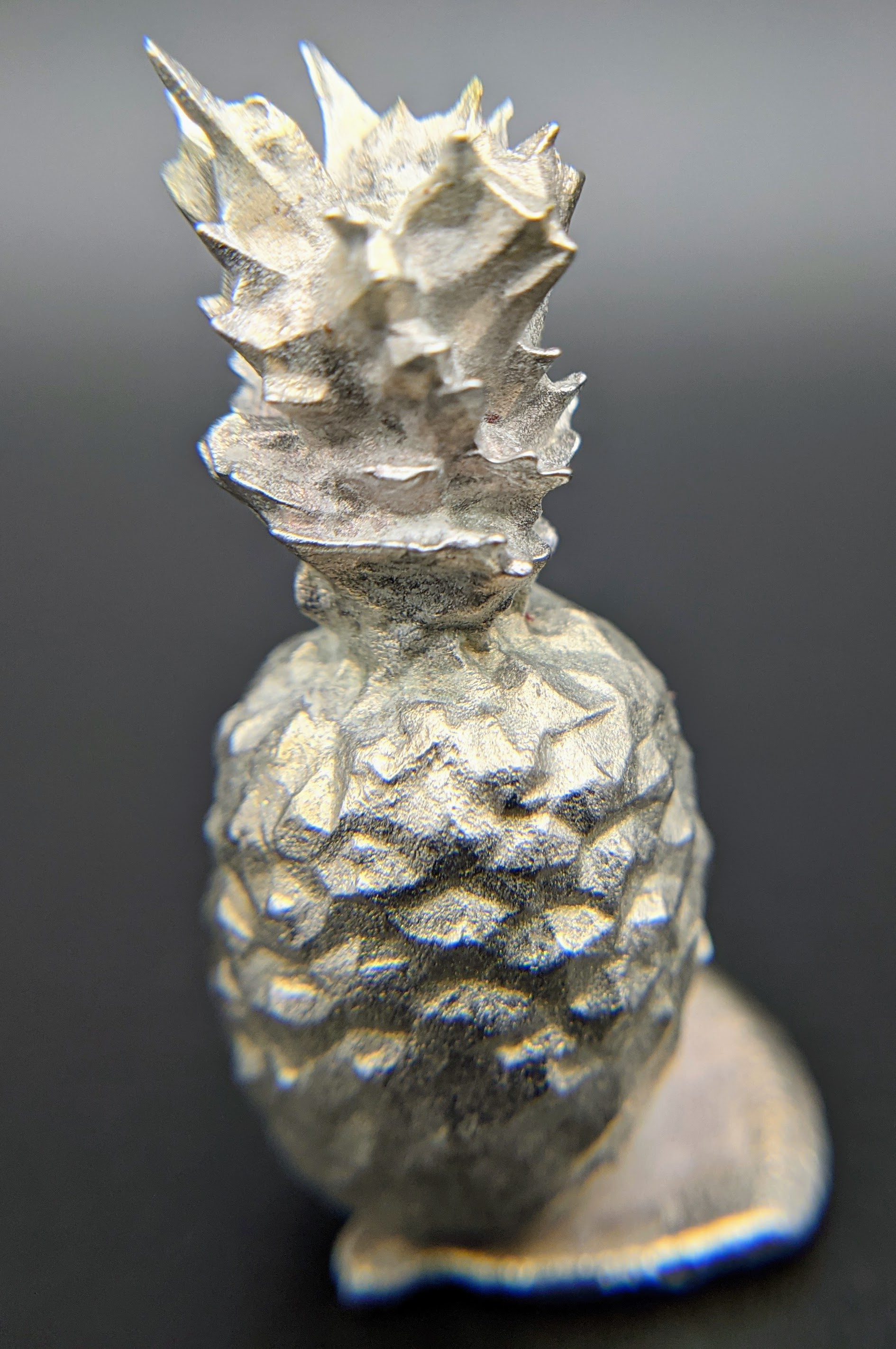 Anyway, we just finished our third project, which was a pewter casting of a pineapple. Why a pineapple? You’d have to ask her, because I have no idea. I just proposed that we go online to find a model of something, 3D print it on my SLA printer, make a silicone mold of it, and then cast it in pewter. She picked a pineapple. You can see the results in the pictures in this post. I’m quite pleased with them.