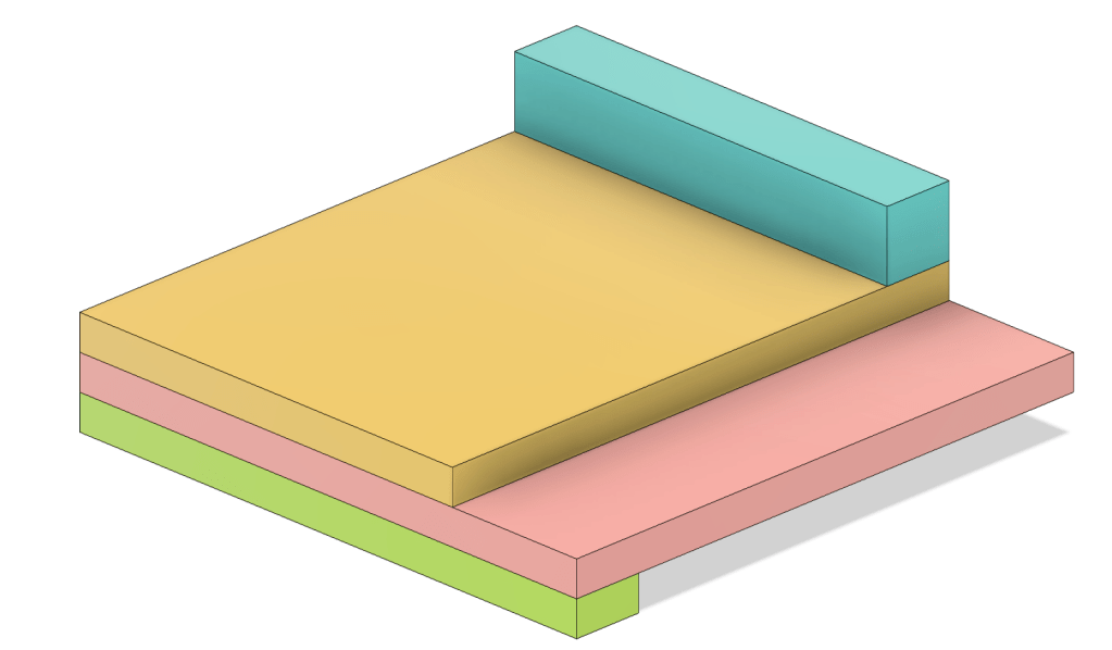 Basic shooting board design: shelf (pink), base (yellow), fence (blue), and cleat (green)