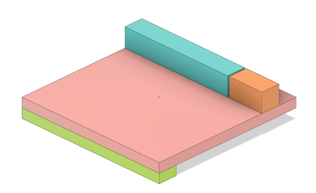 A simple bench hook: base (pink), split fence (blue/orange), and cleat (green).